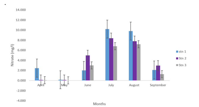 The mean concentration of nitrates across the stations ranged from 3.067±0.716mg/L to 4.454±1.785mg/L in Stations 3 and 1. These are presented in Table 1. Across the months, the concentration of Nitrates (NO2) ranged from 0.10±0.00 mg/L in the month of May to 8.47±0.01mg/L in July as presented in Table 1 and Figure 9. There was no significant difference in the spatial variation of nitrates in the study area (p>0.05). Plankton in the creek
