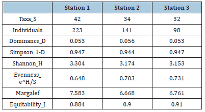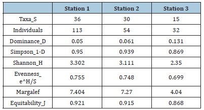 The plankton of an aquatic environment is essential to its sustenance. While they constitute the preliminary point of energy transfer, they are very sensitive to externally imposed changes in the environment. A total of 462 phytoplankton and 199 zooplankton individuals were observed from 9 families, 28 Genera and 34 species. The family Bacillariophyceae (diatom) was the most abundant phytoplankton group. Previous research has shown the abundance of Bacillariophyceae in open waters. The population of phytoplankton is influenced by water temperature, velocity of current, availability of nutrient and light penetration into the water. The dominance of Bacillariophyceae in this study is an expected occurrence. Eight zooplankton groups comprising of 36 species were identified in this study. This result was similar on species that was reported by Zabbey [28]. The uniqueness observed in numerical values of zooplankton species in this study and previous studied was linked to either natural conditions of water bodies, time of sampling or rate of pollution in studied ecosystem. FAO (2000) had earlier reported distributions of zooplankton vary from place to place and year to year due to the dynamic nature of aquatic systems. The type of zooplankton, its numerical value, its distribution in an aquatic environment provides hints on persistent chemical and physical conditions of that specific habitat. Hence, the association among different environmental indices was either be good for growth or death of zooplankton, both in space and time. Zooplankton was underlined as bio-indicators of aquatic environmental perturbation that might be of their easy identification during period of high density and high sensitivity to aquatic environmental change compared to other aquatic fauna [29]. Copepoda was dominant species across all stations and sampling period with about 83% contribution. Simpson’s index for both phytoplankton and zooplankton were highest in stations 1 and lowest in station 3. Similarly, the Shannon Weiner diversity index of 3.153 and 3.304 in stations 3 and station 1 for phytoplankton, 2.35 in station 3 to 3.302 in station 1 for zooplankton and was higher than those of Onuoha [29] who reported the Shannon Weiner diversity index of the Bonny estuary to range from 2.00-2.86, this he attributed to oil pollution. The Margalef diversity indices of phytoplankton and zooplankton showed that the stations were ecologically diverse. The Margalef index for phytoplankton was lowest in station 2 (6.668) and highest in station 1 (7.583), while in zooplankton, the Margalef’s index was lowest in station 3 and highest in station 1. Margalef (1958) indicated that stations with higher diversity index were more stable or expressing less stress than stations with lower values. Margalef index of more than 3 usually depicts good diversity [30,31].