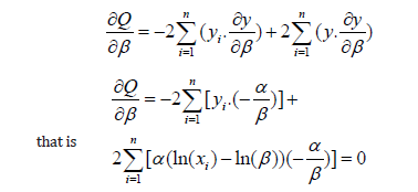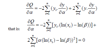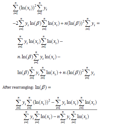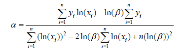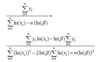 Once the parameter β has been calculated, it is substituted back in the above equation and parameter α is calculated. Note on the values of yi–that is, the values calculated based on the cumulative probability of failures – in the simplest form, they can be obtained in the following form – sort the data ascending based on the values xi, and then calculate the Fi(xi)=i/n, where n is the total number of points in the sample.