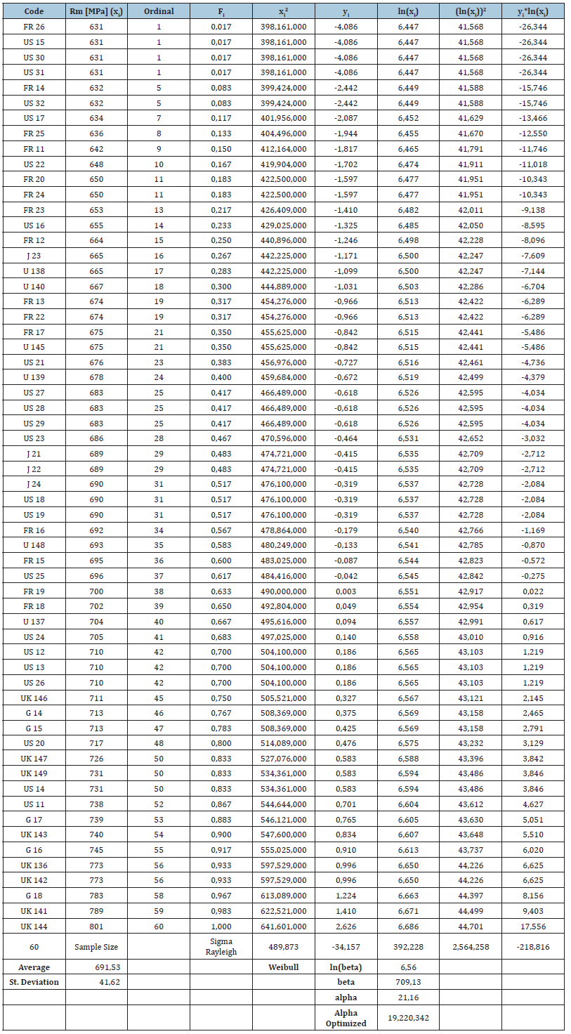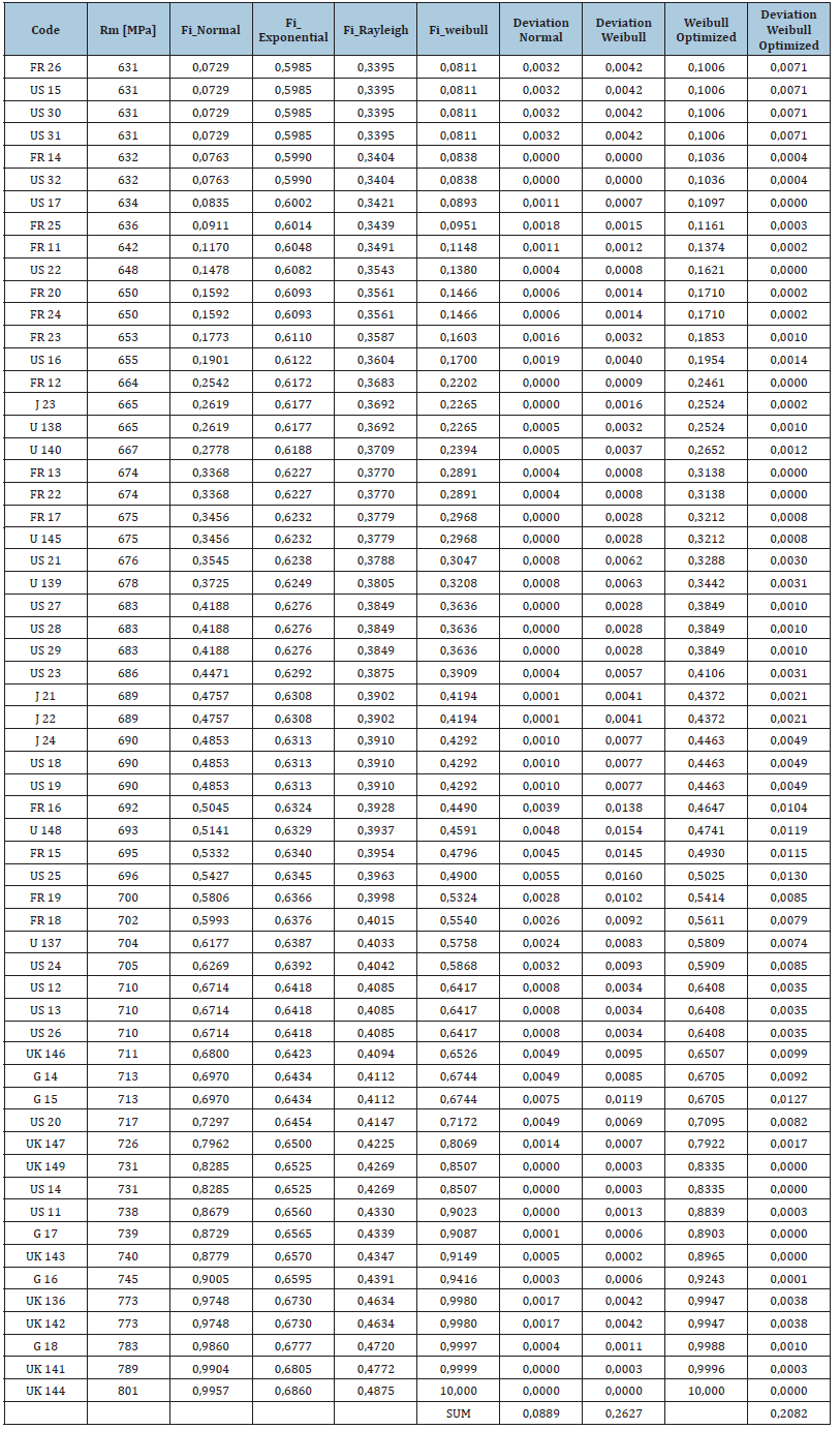 In order to demonstrate the practical application of the developed formulas, we consider a dataset consisting of 60 tensile tests conducted at room temperature for the material 10CrMoVNb9-1 (N168). The primary focus is on estimating the parameters of the distribution and assessing the goodness of fit using the square deviation method. For this purpose, we have compiled the experimental data in a comprehensive table format. This table includes the necessary columns for calculating the individual sums required by the previously derived formulas. The parameter estimation is carried out directly by implementing the formulas in Microsoft Excel. This method proves to be both efficient and accurate, ensuring that the parameters are estimated with a high degree of precision. The Excel implementation allows us to easily handle the computational requirements and verify the results through automated processes. By using Excel, we can take advantage of its built-in functions and tools, such as the goalseek function, which aids in optimizing parameter values for the best fit. Upon analyzing the data, we observe an excellent fit to the normal distribution, indicating that the material properties follow a predictable pattern under the given testing conditions. Additionally, the Weibull distribution also shows a very good fit, further validating the reliability of the data and the robustness of the parameter estimation method. The further optimization of the alpha parameter for the Weibull distribution has been attempted through the minimization of the square deviation (Table 1). This optimization process involves iteratively adjusting the parameter until the deviation between the observed and expected values is minimized. The optimized value is very close to the initially obtained value with the derived formulas, demonstrating very good fit, but also the fact that the given approach might not always achieve the optimal solution. The fitting of parameters using exponential and Rayleigh distributions has shown a poor alignment with the given data. This is primarily because the data exhibits a characteristic failure pattern concentrated around specific values, rather than displaying a random failure distribution over time. Both the exponential and Rayleigh distributions are typically used to model random failure patterns, which is inconsistent with the observed data (Table 2).