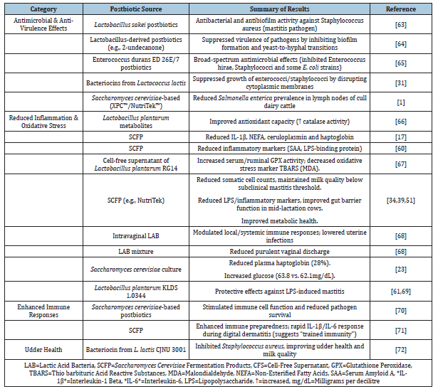 The increasing global demand for sustainable livestock production necessitates alternatives to antibiotic growth promoters, with postbiotics emerging as a viable solution due to their stability, safety and bioactive properties. This review synthesizes research on postbiotics-non-viable microbial components or metabolites, such as those derived from Saccharomyces Cerevisiae Fermentation Products (SCFP), Aspergillus oryzae and Lactobacillus spp. and their effects on ruminant health and productivity. Findings indicate that postbiotics enhance rumen fermentation by stabilizing pH, increasing volatile fatty acid production and modulating microbial populations, particularly fibrolytic bacteria such as Ruminococcaceae and Lachnospiraceae. Immunomodulatory benefits include reduced inflammatory markers (e.g., IL-6, TNF-α) and improved gut barrier function, achieved through the upregulation of tight junction proteins. Species- and dose-dependent responses are evident, with dairy cows showing improved nutrient digestibility and immunity, while beef cattle exhibit variable outcomes in rumen fermentation. Postbiotics also demonstrate antimicrobial effects, reducing pathogens like Salmonella and Staphylococcus aureus. Despite promising results, efficacy depends on the formulation, dosage and the animal’s physiological stage. This review highlights postbiotics as a strategic tool to enhance ruminant performance while aligning with One Health principles, though further research is needed to optimize their application across production systems.