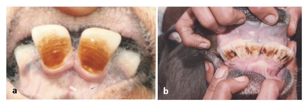 Figure 1:Cattle (a) and buffalo (b) calves with severe dental fluorosis, characterized by deep brownish staining (b) with striated and horizontal stripes on the anterior teeth.