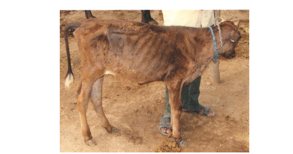 Figure 2:Cattle calves suffer from severe skeletal fluorosis, characterized by weak body, lethargy, loss of body muscles, raised lesions on the legs and ribs, and lameness in the hind legs.