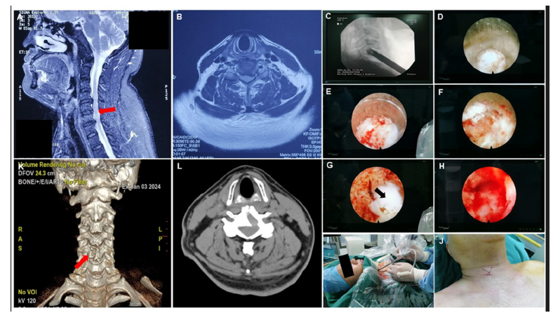 Fgure 1:The surgical procedure. Note: A: The MRI of the patient before surgery. The compression site is marked with red arrow at the junction of the C5 and C6 spinal cord segments; B: patient pre-operative MRI cross-section; C: the front-end of trephine touched the anterior inferior of the vertebra under C-arm lateral fluoroscopy; D, the paravertebral fascia is exposed; E, the process of rotating and cutting using trephine; F, the process of rotating and cutting using trephine; G, the nucleus pulposus is exposed (black arrow); H, the dural sac is exposed, and the pulsation of dural sac can be observed under direct endoscopic visualization. I, surgery in progress; J, the skin was closed by surgical stitching; K, CT guidance and 3D reconstruction after surgery; L, patient post-operative CT cross-section.