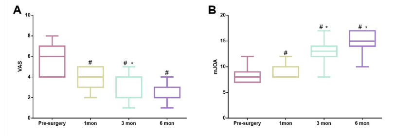 As shown in Figure 2A, there was a notable reduction in VAS after EACCD surgery at different follow-up intervals compared to pre-operation (#P1mon=0.04, Z=-2.842; #P3mon=0.08, Z=-2.673; #P6mon=0.05, Z=-2.810). Moreover, compared to 1-month postsurgery, the follow-up at six months post-surgery showed a significant decrease in VAS (*P=0.019, Z=-2.342). While no statistically different was observed between post-surgery 1 month and 3 months. The findings of functional assessments were like VAS (Figure 2B). The mJOA decreased significantly at different time point compared to baseline (#P1mon=0.01, Z=-2.588; #P3mon=0.005, Z=-2.807; #P6mon=0.003, Z=-2.943). Similarly, the mJOA significantly improved in post-EACCD 3 months and 6 months compared to 1 month (*P3mon =0.012, Z=-2.527; *P6mon=0.003, Z=-2.937).