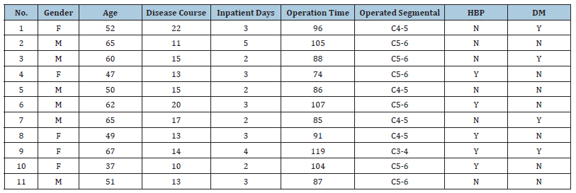 The present study included a total of 11 patients, consisting of 6 males and 5 females, with an average age of 55 (±9.445). The average duration of the CSM and the average length of hospital stay were 14.82 months and 2.9 days, respectively (these two sets of measurements did not conform to a normal distribution) (Table 1).