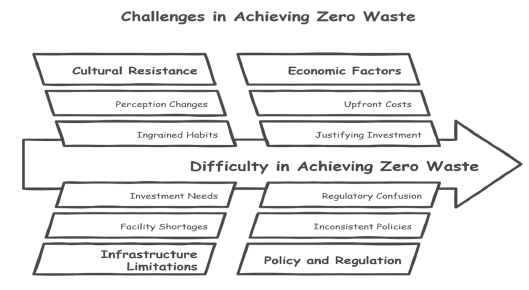 Achieving zero waste is a complex and multifaceted challenge that requires the engagement of governments, businesses, civil society, and individuals (Figure 1). One of the primary obstacles is the existing linear economy model, which is based on a “take, make, dispose” approach. This model is inherently wasteful and unsustainable, and it must be transformed into a circular economy model that prioritizes reuse, recycling, and waste reduction. Another challenge is the lack of infrastructure and financing for zero waste initiatives. In many countries, waste management systems are inadequate, and the necessary investments in recycling facilities, composting plants, and waste-to-energy technologies are not being made. Despite these challenges, there are many opportunities for innovation and progress. The growth of the circular economy, the increasing adoption of sustainable consumption and production patterns, and the development of new technologies and business models are all contributing to a shift towards zero waste (Figure 2).