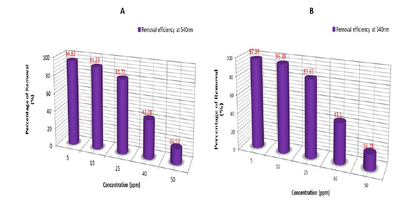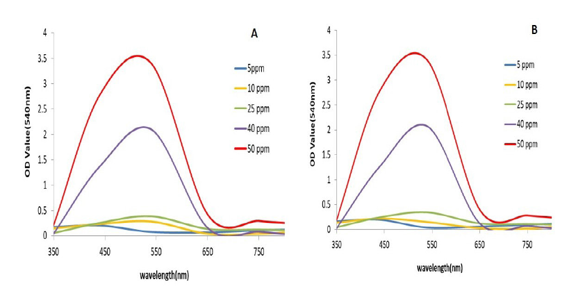 Figure 1:Spectral observation of Chromium removal at 540nm (A) after the 7th day and (B) 14th day.