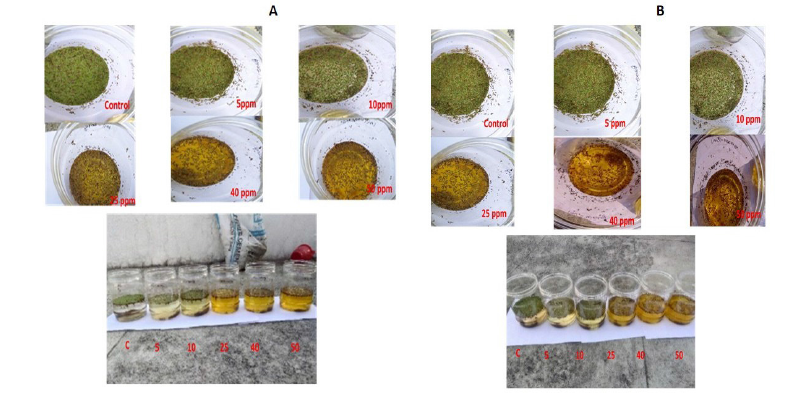 Figure 3:Effect of Chromium Phytoremediation by Azolla pinnata treatment after the (A) 7th day and (B) 14th day.