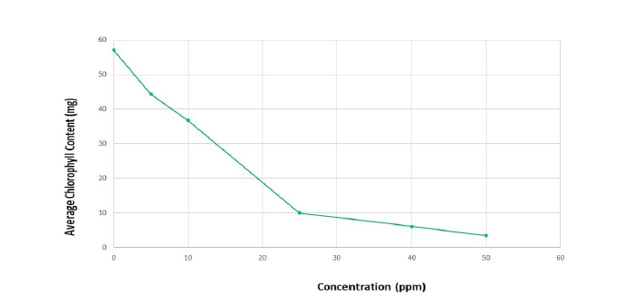 Figure 5 illustrates the impact of chromium on total chlorophyll content following phytoremediation over a period of 14 days. Chlorophyll content was assessed using acetone extracts, in accordance with the Arnon method (1949). The results indicate a decreasing trend in chlorophyll A content as chromium concentrations increased. In contrast, chlorophyll B and total chlorophyll contents showed an increasing trend; however, these overall values still declined with higher chromium concentrations. Elevated levels of chromium toxicity negatively affect photosynthesis. The reduction in chlorophyll content may be attributed to decreased enzymatic activity of protochlorophyllide reductase. Additionally, the lowered levels of photosynthetic pigments in plants could be linked to lipid peroxidation occurring in the chloroplast membranes.