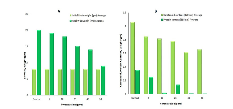 Figure 6A&6B illustrates the impact of chromium on carotenoid and protein content after 14 days of phytoremediation. It shows that as chromium concentration increases, carotenoid content decreases. According to Hou et al. (2007), carotenoids are nonenzymatic antioxidant pigments that protect cells from Reactive Oxygen Species (ROS) under chromium stress. The decline in carotenoid content can be attributed to metal toxicity, which may hinder the formation of photosynthetic pigments. This explains the observed reduction in photosynthetic pigments with increasing chromium concentration. Moreover, protein content also diminishes as chromium levels rise. Specifically, Azolla pinnata shows a reduction in protein content at higher chromium concentrations.