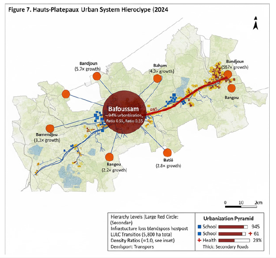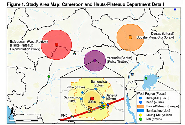 Figure 1 Establishes the multi-scale study framework anchoring fragmentation analysis in Cameroon’s West Region. The main Figure 1 highlights three archetypal sites Bafoussam (fragmentation proxy), Douala (sprawl) and Yaoundé (policy reform testbed) with the western region shaded as the primary geographic focus. An inset details the Hauts-Plateaux “natural experiment,” showing Bafoussam’s centrality, the proximity gradient (Bandjoun 12km→Batié 45km) used to test distance-decay effects (p<0.01), the post-1992 divisional boundaries, and the RN5 corridor.