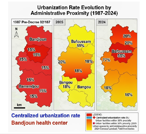 This study provides causal evidence that administrative fragmentation-operationalized through the 1992 Mifi partition (Decree No. 92/187)-constitutes a primary driver of informal urbanization in Cameroon’s rapidly growing regions. Analysis combining natural experimental design, household surveys (N=382), elite interviews (N=40), and 37-year Landsat timeseries yields robust findings across institutional, spatial, and social dimensions that advance theoretical understanding while identifying urgent policy interventions.