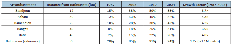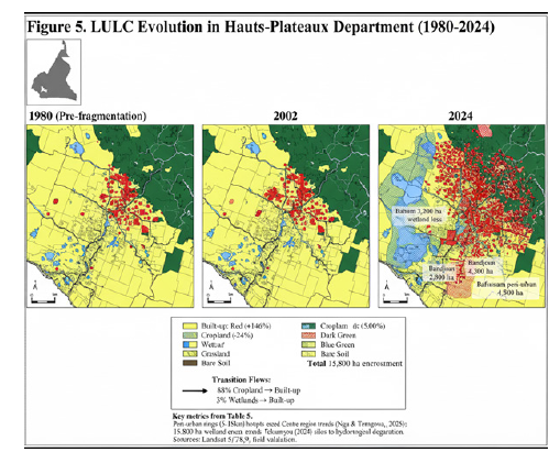 In the West Region’s Hauts-Plateaux Division created by the 1992 fragmentation of Mifi [5] proximity to Bafoussam catalyzed peri-urban growth, with built-up cover rising from roughly 5-10% in 1987 to some 40-50% by 2005 in Bandjoun, in the absence of effective regulatory frameworks; built-up-to-population ratios fell below 1.0, signaling densification rather than spatial expansion [6]. This decentralization paradox reflects broader national patterns: councils in Buea and Limbe contend with overlapping competences that spur ecologically risky expansion affecting large poor populations [7,8]. The 2025 FAO multi-stakeholder platform is drafting a VGGT-aligned National Land Policy, yet operational silos persist: MINDCAF’s titling incentives favor elite allocations, MINHDU zoning remains weakly enforced, councils lack functional capacity (only ~20% of commissions are operational), and chiefs control an estimated 80% of peri-urban allocations [1,9]. These governance vacuums drive informal sprawl, evictions, wetland encroachment and associated health inequities.