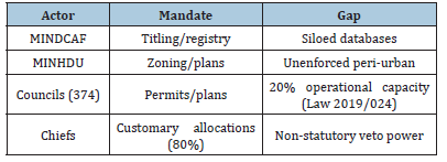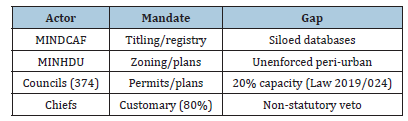 Jurisdictional fragmentation denotes both vertical splits (ministries versus councils) and horizontal functional overlaps (e.g., MINDCAF titling vs. MINHDU zoning) that erode coordination [6]. Unlike mere administrative complexity, fragmentation produces operational dysfunction through unclear mandates and asymmetric authority-a distinction theorized by Ostrom [17] in her analysis of institutional misfit and more recently applied to African urban land governance by Rakodi [18] and Lund [19], who show that overlapping jurisdictions generate “twilight institutions” that neither state nor customary actors fully control. Studies of Nigerian, Ghanaian and Tanzanian cities similarly document how ministerial proliferation-without inter-agency data-sharing or unified cadastral systems-systematically generates double allocations and dispute cascades [20-22].