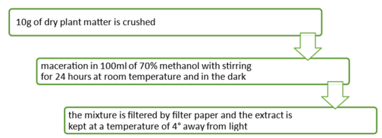 The active compounds are present in algae in small quantities, the extraction of secondary molecules from the algae is a method which makes it possible to obtain a concentrated extract with the slightest change in the characteristics of these molecules. It is obtained after 24 hours of maceration in methanol, this will help us determine the yield of extract from 10g of crushed and dried algae. The yield of the extract is estimated at (22.62%±0.037). The extraction yield depends on the nature of the solvent, its composition and its concentration, the extraction method as well as the physicochemical properties of the compounds to be extracted [6]