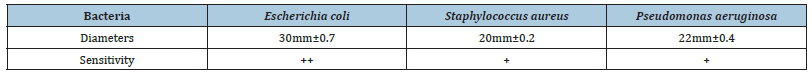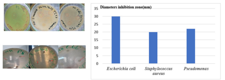 Antibacterial activity: The study of the antibacterial and antifungal power is carried out by diffusion on solid medium using the disk method, it makes it possible to estimate the antibacterial effect of our extract by measuring the diameter of the inhibition zones around the discs impregnated in the methanolic extract (Figure 3). The results of this analysis are presented in the following (Table 4). The algae extract has a strong effect on E. coli, their inhibition zone is 30mm±0.7, Pseudomonas has less sensitivity than E. coli, their inhibition diameter is approximately 22mm±0.4. As for Staphylococcus aureus, they proved to be more resistant to the extract compared to other species of bacteria with a diameter of 20mm±0.2. Comparing with the control, the results show that Gramnegative bacteria (Escherichia coli and Pseudomonas aeruginosa) are more sensitive than Gram-positive bacteria (Staphylococcus aureus).