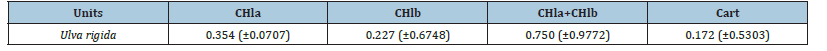 Photosynthetic pigments: The contents of chlorophylls a and chlorophylls b and carotenoids in the Ulva rigida extract are represented in mg/g of FW in Table 2 and Figure 2. According to [8], the rate of chlorophyll a of Ulva rigida which was harvested in the Chilika region in India is 13%, that of chlorophyll b of 7.5% and that of carotenoids is 4.5%. The chlorophyll content was estimated at 21%. The contents of photosynthetic pigments in our sample and those of Satpati are relatively close, the content of chlorophyll a and chlorophyll b of our sample is greater in relation to the carotenoid content, these results are in agreement with the study of [8].