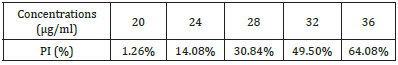 Antioxidant activity: The results of the percentages of DPPH inhibition are mentioned in (Table 3). According to the results obtained (IC50 value is 32μg/ml), we notice a proportional relationship between the concentration and the percentage of inhibition. At a low concentration of 20μg/ml, the methanolic extract shows a low DPPH reduction percentage of approximately 1.26%, at a medium high concentration 28μg/ml. The DPPH reduction percentage is estimated at a value of 30.84%. The IC50 value expressed in μg/ml was determined from the regression line of the percentage of inhibition as a function of the concentration for each sample.