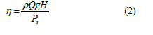 where η is efficiency (%), ρ is density (kg/m3), Q is flow rate (m3/s), H is pump head (m) g is gravitational (m/s2), and Ps is shaft power (W).