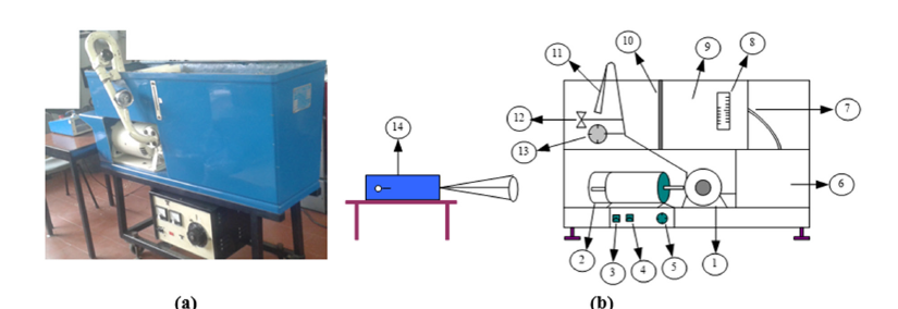 Figure 1:(a) Pump unit, (b) Experimental schematic [10]. Description: 1. Pump, 2. Electrical motor, 3. Volt meter, 4. Ampere meter, 5. Power button, 6. Bottom tank, 7. Water outlet (V type), 8. Flow rate scale, 9. Upper tank, 10. Water stabilizer, 11. Diffuser (water inlet), 12. Regulator valve, 13. Pressure manometer and 14. Tachometer