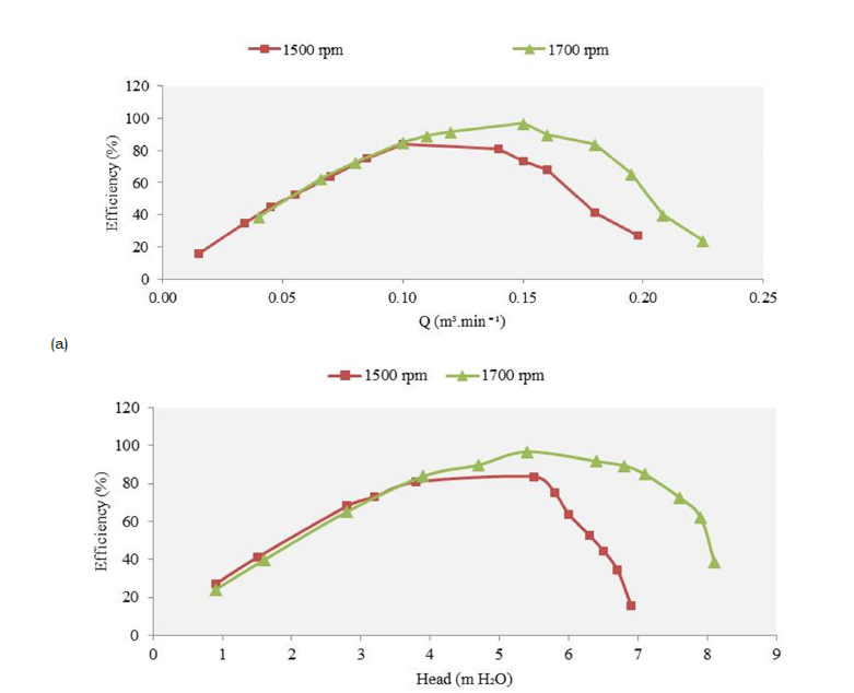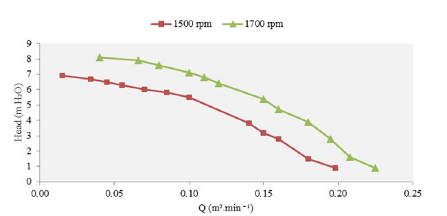 In this section presents the experimental results regarding to head, flow rate and efficiency. The data applied in this experiment including electrical potential of 122 volt, electrical current 0.9 ampere is referred to pump speed at 1500rpm and tested at various head is ranged from 0.9 up to 6.9mH2O. In addition, the electrical potential of 140 volt, electrical current 1.0 ampere is referred to pump speed at 1700rpm and tested at various head is ranged from 0.9 up to 8.1mH2O. The experimental data is calculated and presented in Table 1.