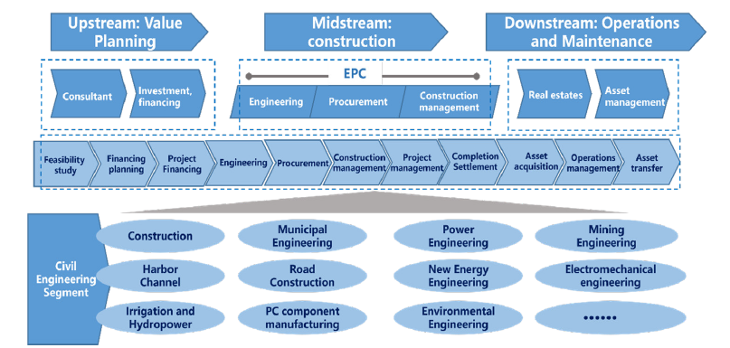 Figure 1:Schematic diagram of the upstream and downstream extension of the whole industry chain of China national nuclear construction engineering and engineering construction.