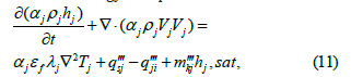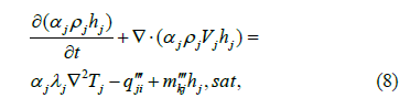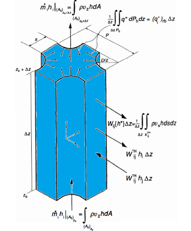 where hj is entalpy of phase j,λj is thermal conductionof phase j,qji′′′ is heat sources from fission,hj, sat, is saturation enthalpy of phase j. Heat transfer is a discipline of thermal engineering that concerns the generation, use, conversion and exchange of thermal energy (heat) between physical systems. Heat transfer is classified into various mechanisms, such as thermal conduction, thermal convection, thermal radiation and transfer of energy by phase changes. Engineers also consider the transfer of mass of differing chemical species (mass transfer in the form of advection), either cold or hot, to achieve heat transfer. While these mechanisms have distinct characteristics, they often occur simultaneously in the same system. Subchannel control volume for energy (enthalpy) balance is shown in Figure 7. The above equation can be re-written for a porous medium as: