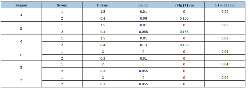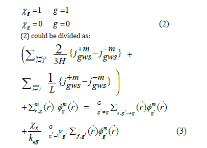 where H and L are dimension of cell. In regular center count, homogenization mistake is caused because of the conservation of just response rate. The brokenness factor which is the proportion of heterogeneous motion to homogeneous motion of the hub, is acquainted with saving both response rate and surface arrived at the midpoint of current at the same time and along these lines stay away from this homogenization blunder. These components are remembered for the connection between active and approaching incomplete flows through one surface of a hub and approaching incomplete current through a similar surface of a neigh boring hub. These elements are to be determined by some cross-section code, before dissemination count. Successful augmentation factor is determined by doing a number of internal and external emphases. In internal emphasis, keeping the parting source consistent, neutron motion is determined from halfway flows which are gotten external emphasis, parting source (F) is refreshed with these motion esteems. The removal cross-sections, Σr , are summation of absorption, Σa and scattering, Σa , as: