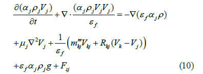where ρj is the volume density of phase j, p is pressure, μ is the viscosity and mkj′′′ is mass generation, R is the velocity constants for entrained flow. The subchannel control volume for momentum balance is shown in Figure 6.