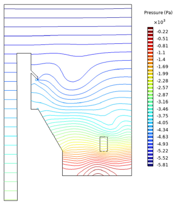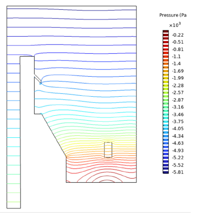 In the CFD analysis of natural convection in a research nuclear reactor, the criteria include studying the flow velocity, temperature distribution, and pressure drop within the reactor. CFD simulations are used to analyze the behavior of the coolant, the heat transfer mechanisms, and the overall thermal performance of the reactor. This helps to ensure the reactor operates safely and efficiently. Figure 14 shows the cross-sectional pressure profile through the porous region. Figure 14 shows the consistent state temperature disseminations along vertical focus lines at x = 0m and a level line along the x-pivot at y = 0m. Figure 14 shows that the vertical temperature dispersions display fundamental uniqueness along the y-hub. This implies the stream design along the hub bearing is less uniform, that is, more three-dimensional than that of Case. The more grounded planes at the channel spouts framed a progressively lively stream blending in the cylinder pack locale. The comparable impact is additionally appeared in the flat temperature profile as appeared in Figure 14. Pressure distribution shows a stratified regime which is preventing any further vortex in the system.