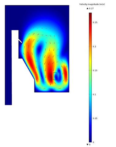 Figure 13:Cross-sectional velocity magnitude and vector through the porous region at 500kW.