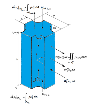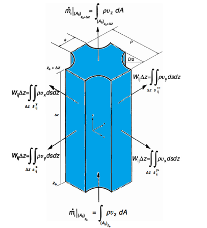 A sub-channel control volume in a reactor core is a node cell of an assembly. Control volume presentation could be used for mass conservation, axial transverse momentum equations and energy equations. Figure 4 presents the control volume for porous body analysis. When considering the axial flow rate of a selected subchannel control volume, we’re looking at the mass transport within that specific volume. It involves analyzing how the fluid or material is flowing along the axial direction in that particular region. This is important for understanding the distribution of mass and how it affects the overall system behavior. Mass transport for the axial flow rate of the selected sub-channel control volume is:
