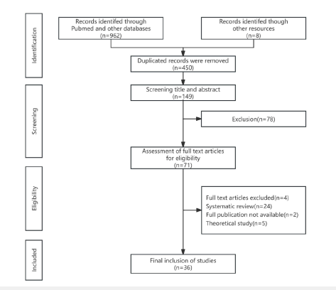After reviewing the title and abstract, the search identified 450 potentially relevant documents. Among them, 36 papers met the inclusion criteria after full-text review (Figure 1).