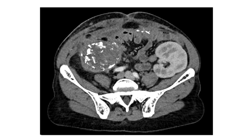Figure 1:Calcified failed right transplant kidney. calcified, non/hypo-enhancing right failed kidney parenchyma with surrounding fat stranding.