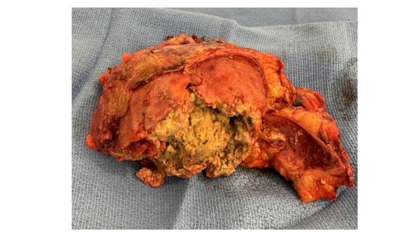Figure 2:Explanted infected right kidney. photos taken during nephrectomy. visualized parenchyma with diffuse necrosis and abscess formation.