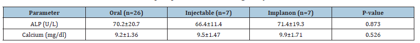 The current study aimed to evaluate the serum levels of calcium and AlkaLine Phosphatase (ALP) among Sudanese women using contraceptives in Shendi city. The results demonstrated a statistically significant increase in the mean serum calcium level among contraceptive users compared to non-users (P=0.000), which suggests that hormonal contraceptive use may influence calcium homeostasis. This finding is consistent with the study conducted by Akinloye et al. who reported higher calcium levels in women using contraceptives compared to controls [6]. However, it contradicts the findings of Raad et al. who observed no significant difference in serum calcium levels between users and non-users of hormonal contraceptives [7]. Such discrepancies might be attributed to variations in dietary habits, sample size, or geographical and lifestyle factors. In contrast, the study revealed no statistically significant difference in serum ALP levels between the two groups (P=0.101), aligning with the findings of Panel et al. who also found no significant alterations in ALP levels among women on long-term oral contraceptive therapy [8]. This indicates that while calcium levels may be affected by contraceptive use, ALP levels appear to remain stable in most cases. When examining different types of contraceptives (oral, injectable and Implanon), the current study showed no significant differences in serum calcium or ALP levels between the subgroups. This is in agreement with Raad et al. who reported no substantial variations in biochemical bone markers across different types of hormonal contraceptives [7].