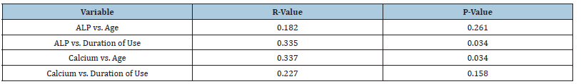 correlation was found between ALP and duration of use (r=0.335, p=0.034).