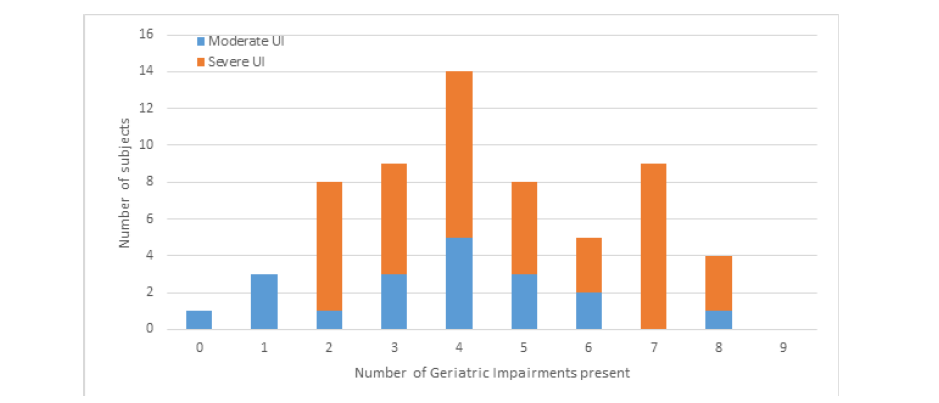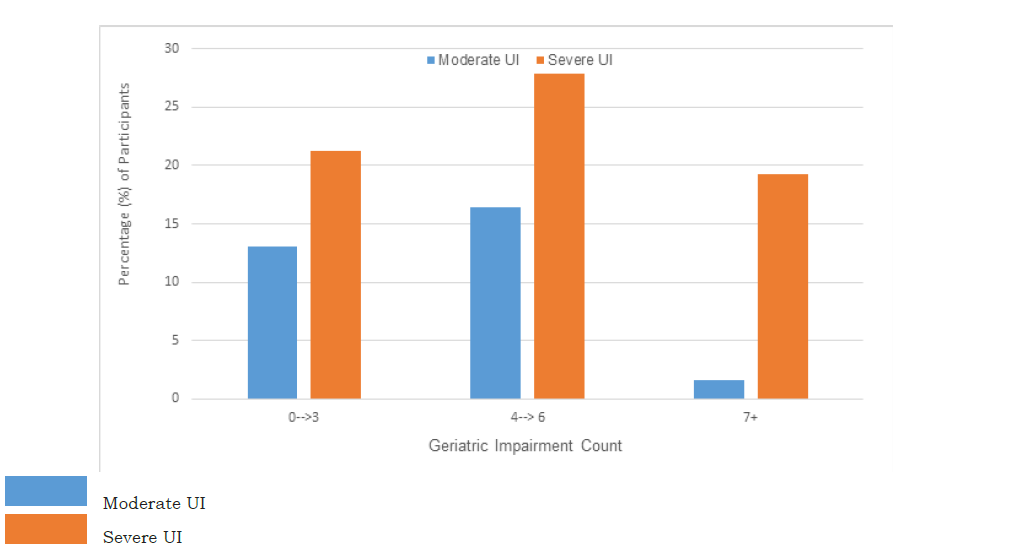 Result: The count of geriatric impairments was significantly higher among women with severe UI compared to those with moderate UI (mean±SD= 4.4±1.8 vs. 3.4±2.0, p=0.04). Out of 9 geriatric impairments, 62% of participants had 4 or more present.