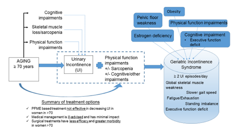 Figure 2:Conceptual framework proposing the mechanism of the geriatric incontinence syndrome phenotype based on cumulative geriatric impairments.