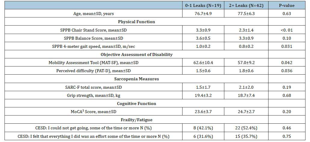 Eighty women completed in-person screening; nine of these were screen fails, yielding 71 enrolled. Ten women did not return their baseline bladder diary and were consequently excluded, leaving 61 women in this analysis. The mean±SD age was 77.3±5.9 years. Women with more severe UI were predominant (69%). Other pertinent demographic and clinical characteristics of the cohort have been previously published, but there were no significant differences based on UI severity [12] (Table 2). When we examined the targeted geriatric impairments individually, we observed that chair stand pace and gait speed were significantly slower among women with severe UI compared to women with moderate UI (Table 2). Women with severe UI symptoms also had significantly lower MAT-SF scores indicating greater disability with mobility and significantly higher PAT-D scores that indicated greater disability with activities of daily living (Table 2). There were no significant statistical differences in the presence of mild cognitive impairment, frailty, or sarcopenia risk based on the MoCA, SARC-F, and grip strength respectively between groups based on UI severity (Table 2).