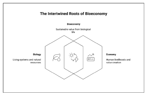 Figure 1 illustrates how the bioeconomy emerges from the intersection of biological systems and economic activity. The diagram highlights that biology provides the foundation of living systems and natural resources, while the economy represents human livelihoods and value creation. In the overlapping space, the bioeconomy is shown as the generation of sustainable value from biological life, integrating ecological processes with economic pathways. This visual representation emphasizes that a resilient and future-oriented bioeconomy depends on maintaining the integrity of natural systems while fostering innovation, production, and societal wellbeing.