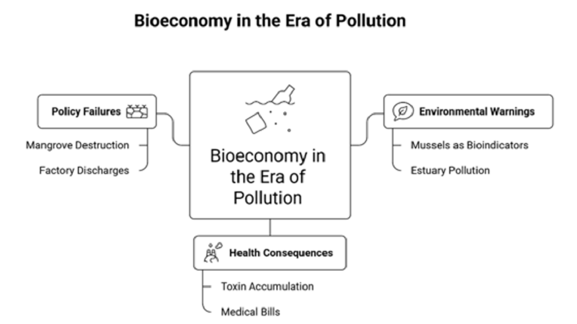 Figure 5 illustrates how the bioeconomy becomes increasingly vulnerable when pollution undermines the ecological systems that sustain it. The diagram shows three interconnected pressures: policy failures such as mangrove destruction and factory discharges, environmental warnings observed through bioindicator species like mussels and rising estuary contamination, and the resulting health consequences including toxin accumulation and rising medical burdens. Together, these elements demonstrate that a polluted environment weakens both ecological resilience and economic wellbeing, highlighting the need for stronger governance and ecosystem protection to sustain a viable bioeconomy.