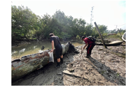 Figure 8:Molluscs sampling at the mangrove area near Jetty Pengkalan Nelayan Telok Gong, Klang, captured on 25 March 2023. On the left is Mr. Austin Hew, and on the right is Mr. Ezzafel; both of whom were my hardworking and dedicated final-year undergraduate students. This photo captures their commitment as they braved the thick estuarine mud to collect samples for their ecotoxicological project. This photo was taken by Maisara.