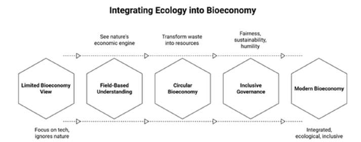 Figure 9 illustrates the gradual transition from a narrow, technology-driven view of the bioeconomy to a modern approach that is ecological, integrated, and inclusive. The sequence shows how understanding nature’s economic functions, adopting circular practices, and embedding fairness and sustainability in governance collectively reshape the bioeconomy into a system grounded in ecological principles and societal wellbeing.