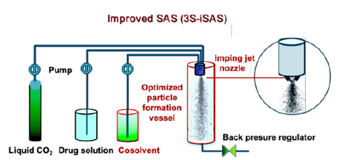 This configuration was different from published SAS apparatus. In brief, the flows of CO2 and drug solution were solely or discretely pumped into the vessel in SAS which not fully use the jet turbulence energy. The advantages of 3S-iSAS apparatus are that the imping jet nozzle with small orifice from 50μm to 200 μm and the liquid CO2 pump with high flow rate up to 200ml/min as well as the particle formation vessel with volumes from 100ml to 1000ml (pilot scale) could be assembled multi-configurations and offered stronger jet turbulent pattern to tailor the particle formation. The stream of ScCO2 and BUDs solution are simultaneously pumped into the particle formation vessel through the imping jet nozzle coming into being the turbulent jet of mixtures and leading to nucleation and precipitation due to phase separation and supersaturation of the solute in ScCO2. Particle size and surface properties of the formed particles could be finely tailored by means of the process parameter optimization.