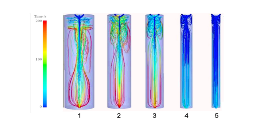 Figure 2:The CFD simulations of the 3S-iSAS apparatus improvements show that the turbulent eddy region rises from the bottom to the top and is confined to the flow region near the nozzle. Also, the time streamline that shows the particle trajectory is parallel to the vessel wall, reaching its bottom in the shortest amount of time.