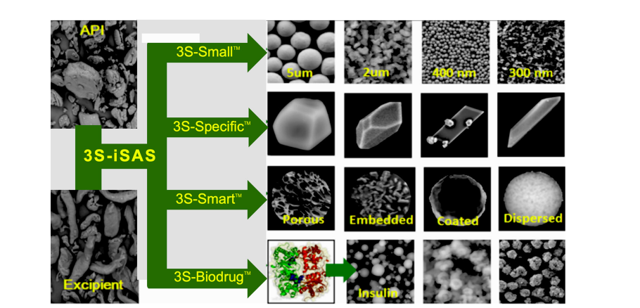 In terms of the innovative improvements of the process, based on the mechanism of drug particle formation in ScCO2 and a large amount of production experimental data, four proprietary routes of 3S-iSAS process have been established to achieve the company’s vision of making “small and smart particles for super drugs”, as shown in Figure 3.