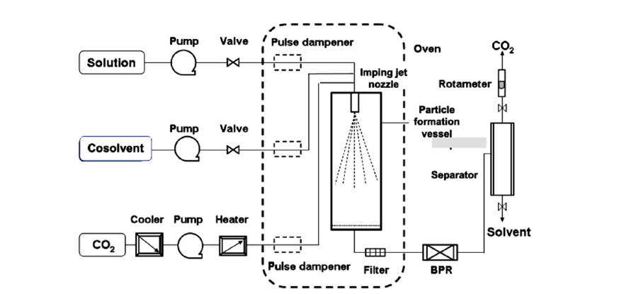 In order to produce inhaled particles with low surface energy characteristics and minimal aggregation, the 3S-iSAS technology has made innovative improvements in both apparatus and processes. The innovative improvements of the 3S-iSAS apparatus include the addition of a co-solvent input channel and an imping jet nozzle, optimizing the aspect ratio of the particle formation vessel, as shown in Figure 1.
