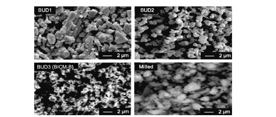 microspheres of budesonide-based series (BICM-BUDs) have been successively developed, including BICM-B (budesonide), “Two-in-one” BICM-BF (budesonide and formoterol), and “Threein- one” BICM-BGF (budesonide/glycopyrronium/formoterol). They have minimal agglomeration, excellent dispersibility, aerodynamic performance, batch consistency, and stability at room temperature. For in vitro carrier-free inhalation evaluations, the lung deposition rate of BICM-B has exceeded that of the marketed Pulmicort®.